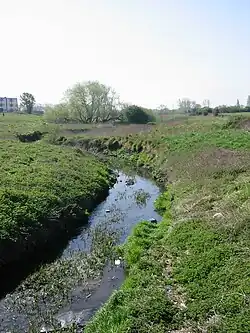 South of Dagenham was a low-lying area including the Dagenham levels and Dagenham Marsh, these having been subject to periodic flooding from the Thames, and flood banks were built to protect the farmland, culminating in defences and a flood gate on the River Beam being built in the 17th century by Dutch engineers.[5] In 1707 an exceptionally high tide swept away fourteen feet of embankment and flooded over 1,000 acres of land, the description given by Daniel Defoe when he visited eight years later giving the area inundated as being 5000 acres is today considered an exaggeration.[5]