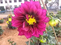 Sherff (1955), in the first modern taxonomy described three sections for the 18 species he recognised, Pseudodendron, Epiphytum and Dahlia.[29] By 1969 Sørensen recognised 29 species and four sections by splitting off Entemophyllon from section Dahlia.[30] By contrast Giannasi (1975) using a phytochemical analysis based on flavonoids, reduced the genus to just two sections, Entemophyllon and Dahlia, the latter having three subsections, Pseudodendron, Dahlia, and Merckii.[31] Sørensen then issued a further revision in 1980, incorporating subsection Merckii in his original section Dahlia.[32] When he described two new species in the 1980s (Dahlia tubulata and D. congestifolia), he placed them within his existing sections.[33] A further species, Dahlia sorensenii was added by Hansen and Hjerting in (1996).[34] At the same time they demonstrated that Dahlia pinnata should more properly be designated D. x pinnata. D. x pinnata was shown to actually be a variant of D. sorensenii that had acquired hybrid qualities before it was introduced to Europe in the sixteenth century and formally named by Cavanilles.[1] The original wild D. pinnata is presumed extinct. Further species continue to be described, Saar (2003) describing 35 species.[8] However separation of the sections on morphological, cytological, and biochemical criteria has not been entirely satisfactory.[8]
