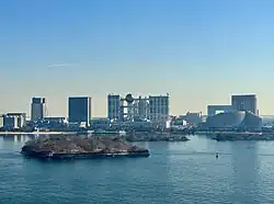 Odaiba (お台場) is a large artificial island in Tokyo Bay, Japan, across the Rainbow Bridge from central Tokyo. Odaiba was initially built for defensive purposes in the 1850s. The land was dramatically expanded during the late 20th century as a seaport district, and was redeveloped in the 1990s into a major commercial, residential and leisure area. Odaiba, along with Minato Mirai 21 in Yokohama, is one of the few manmade seashores in Tokyo Bay where the waterfront is accessible and not blocked by industry and harbor areas.