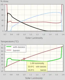 is an imaginary grey world orbiting, at a similar distance to the Earth, a star like our Sun that gets brighter with time. The environment... is reduced to one variable, temperature, and the biota consist of two types of life, black and white daisies, which share the same optimum temperature for growth and limits to growth. The soil of Daisyworld is sufficiently well watered and laden with nutrients for temperature alone to determine the growth rate of the daisies. The planet has a negligible atmospheric greenhouse, so its surface temperature is simply determined by... [the hypothetical star's] luminosity and its [the planet's] overall albedo [reflective power, the fraction of incident radiation reflected by the surface], which is, in turn, influenced by the coverage of the two daisy types.[4]