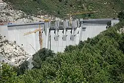 The generating unit of the dam consists of two 57 MW Francis turbine units with a maximum flow rate of 220m³/s and a small 4.1 MW unit to turbine the ecological flow, producing 159 GWh of electricity a year. The spillways are located over the dam and consist of four radial gates with a width of 11.5 m and height of 9 m each with a maximum discharge capacities of 3,400 m³/s.[4]