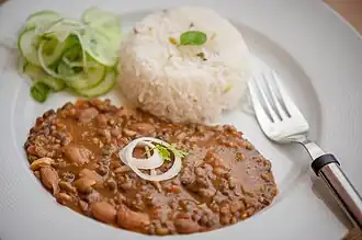 Dal makhani (pronounced [daːl ˈmək.kʰə.ni]) is a dish originating in Punjab region.[2] A relatively modern variation of traditional lentil dishes, it is made with urad dal (black beans) and other pulses, and includes butter and cream (makhani is a Punjabi word for butter).[3][4]