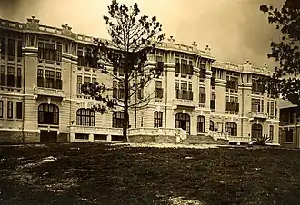 Originally called the Lang-Bian Palace Hotel, it was completed and opened in 1922, at the height of an economic boom, and was designed to be a site of colonial leisure and power. 'The hotels monumentalism, modernity, luxury and location made it a conspicuous symbol of French domination over the Indochinese central highlands.'[1] It was positioned at the centre of a European business and administrative quarter, dominated the "native quarters" and served as a buffer between them and the European villas. As a luxurious establishment it could act also as a serene base from which to explore highland minority villages or conduct big-game expeditions, and meant to compete with the poshest colonial hotels of Southeast Asia, such as the Oriental Hotel, Bangkok and the Raffles Hotel, Singapore.[2] It initially featured thirty-eight luxury rooms, as well as an orchestra, a cinema, tennis courts, private fruit and vegetable gardens, a dance hall, riding facilities, gymnastic equipment and a French restaurant. Architecturally the Palace followed metropolitan French resort styles, merging elements of spa towns like Vittel with seaside architectural elements borrowed from towns like Cabourg or Cannes. French novelist Morgan Sportès, in his depiction of Indochina during WW2, has described it as reminiscent of the Negresco Hotel, in Nice.[3] When economic circumstances changed, later in the 1920s, most plans for government structures in Dalat were abandoned, leaving the town with a Palace Hotel as its monumental centerpiece.