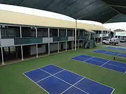By 2016 a number of other buildings had been added to the school, including a music block (c. 1987) northwest of Block C, and a new manual block northwest of Block J by 1990; a new home economics block west of Block E, with new tennis courts further west, and a new administration building northeast of Block F by 1998; and a small building north of Block E by 2004.[101][102][103][104] In 2011 a trade training centre was added northwest of the hall, and by 2013 there was a new building northeast of the 1960s science block and the library had been extended. A Year 7 building was constructed west of the music block in 2014.[105][106] In 2016 Block J was renovated, with new interior linings, new windows to existing openings, and new doorways to the eastern side.[1]