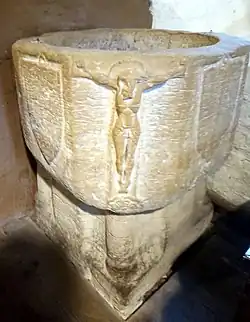 Muskham attributes the first part of the foundation legend to Matilda de Salicosa Mara of Lindsey, a local landowner whom he regarded as foundress of the community at Dale.[6] Muskham's chronicle places the origins of the abbey early in the previous century and credits the initiative to a local baker who experienced a vision of The Blessed Virgin Mary[7] telling him to go to Depedale.[8] The baker kept the religious experience secret but immediately set off eastward. Passing through the village of Stanley, he overheard a woman dispatching her daughter to Deepdale with a herd of calves. The former baker took this as a sign from God and asked the woman the way. He was told to follow the girl to Deepdale and so quickly arrived at his destination, described as locum palustrem valde terribilem longeque ab omni habitacione hominum separatum[9] — "a marshy place, extremely frightening, and far from human habitation." At the south east edge of the place he cut out a small rock house in the hillside and settled to an ascetic existence. A local landowner is named as Ralph Fitz Geremund, lord of a moiety of the manors of Ockbrook and Alvaston cum soc, i.e., holder of soke, the right and duty to constitute a court. He is portrayed by the chronicle as a Norman baron with interests on both sides of the Channel.[10] He was so impressed by the hermit and the wretchedness of his existence that he granted him a tithe of the proceeds of his own mill at Burgh (now thought to be at Alvaston, although earlier at Borrowash).[11] The remainder of the hermit's story is attributed to one Humfrid, a former canon. The hermit suffered spiritual torment in his later years, said by the chronicler to be the assaults of antiquus autem generis humani inimicus milleartifex[12] – "the ancient enemy of human kind, master of a thousand tricks," that is, Satan. To gain relief from these assaults, and from the lack of water at his hermitage, he searched for a new home.[13] By a spring in the little valley below he built a hut for himself and an oratory, dedicated to God and to the Blessed Mary, who seems to have been central to his spiritual life. There he lived in God's service until his death, which is described by the chronicler in almost Manichaean terms as release from the ergastulum, prison, of the body.[14]