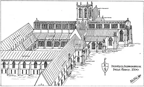 William FitzRalph left his daughter and her husband to work out the details of the new foundation, pleading the urgency of the king's business overseas. The couple went to meet Abbot Lambert of Newsham or Newhouse Abbey and secured from the chapter a delegation of nine canons to establish a colony at Deepdale.[50] Some of the founding canons are named by the chronicler: Walter de Senteney, John de Ryford,[51] Hugh de Grimsby, Roger de Alesby, William le Sores. The Victoria County History account of Dale Abbey, edited by William Page, but written by John Charles Cox, dates this to 1195, which seems too early, while the earlier account of Newsham, also edited by Page, has Lambert occurring 1200–3,[52] a much more plausible time frame. Colvin reckoned that the leader of the canons, Walter de Senteney, became abbot of Dale in January 1200.[53] The date accepted for the foundation of Abbey is 15 August, the Feast of the Assumption, 1204, as reported by Bishop Richard Redman, Vicar-General of the Abbot of Prémontré, during his canonical visitation in 1478.[54] This probably marks the founding or consecration of the new abbey church, rather than the inception of the convent itself.[43] However, there are considerable problems with the chronology and order of events – partly because the relevant royal confirmation charters and papal bulls are missing from the cartulary – that make an entirely satisfactory account of the foundation of Dale Abbey impossible.[55] Whenever the new community was founded, it would have been a priory initially, as the complement required for an abbey would be 12 canons and their abbot, based on the precedent of Christ and the Twelve Apostles. The 1204 date perhaps simply reflected the achievement of a steady quorum: the precise date reflects the Premonstratensian preoccupation with the Assumption of Mary, a doctrine that was not confirmed as a dogma until Pope Pius XII's definition in 1950.