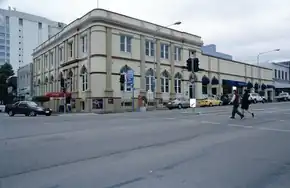 On either side of the main Sturt Street entrance more modest pilasters extend from the plinth level through to the parapet giving a uniform visual effect. These are spaced at regular intervals. A second less ornate entrance is situated on Denham Street. On both Denham and Sturt streets above the base plinth are white painted top hung aluminum windows situated at regular intervals. Original timber four-segmented lights cap them. The aluminum windows are sympathetic to the original double hung timber windows.[1]