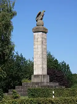 The eagle monument commemorates the old Roman town Ricciacum and is also the symbol of Dalheim. The huge stone blocks forming the solid base of the monument were excavated in the 19th century, not far from their present location. The blocks no doubt date back to Roman times (middle of the 3rd century). They may have been removed from the Roman theatre in order to serve as the foundations of a burgus or defensive watchtower. The monument itself was built by the Archaeological Society of Luxembourg. On 28 May 1855, the groundbreaking ceremony was held in the presence of William III of the Netherlands who was also Grand Duke of Luxembourg. The memorial commemorates the presence of the Romans on Dalheim's Petzel plateau. Standing on a globe, the eagle seems to be looking in the direction of Trier while its body is facing Metz, symbolizing the old road from Metz to Trier.[3]