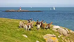 The ruined stone church may be as old as the 7th century and was probably abandoned for a period when the Vikings used the island as a base and there is evidence that the island was used as a slave market during this period. The Annals of the Four Masters says that in 938. Coibhdeanagh, the Abbot of Cill-achaidh, drowned in the sea off the island trying to escape with treasures from the church hidden in his vestments during one Viking raid. In the early 19th century the Admiralty erected the Martello Tower, one of eight dotted along the Dún Laoghaire coastline, as an early warning defensive device against the one-time threat of invasion during the Napoleonic Wars. A herd of goats, originally put on the island in the early 19th century, remains there today but they are replacements for the original goats who were removed.