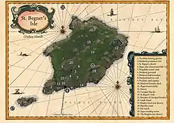 There is evidence it was inhabited in the 4th millennium BC (6,000 years ago) and was also used as a Viking base. A number of early medieval pieces of pottery and glassware were found on the island. Some of these artefacts came from the Mediterranean area, possibly Turkey or Greece.[7] It was an important site of pilgrimage in the medieval period as evidenced by the prominence of the island on early maps. One such, Danti's map of 'Isole Britaniche', painted on the wall of the Palazzo Vecchio in Florence (c. 1560) survives as a remarkable record. It was believed that 'taking' water from the well attributed to the saint could cure scurvy. Recent tests of the water show that it has high levels of vitamin C (the cure for scurvy), probably due to its position below a salt marsh. There are ruins of a church, dating to the 7th century, which is named for St Begnet. An older wooden church was probably here before the present stone one was built. Another church in nearby Dalkey also named for St Begnet may have been a 'base' for pilgrims before they crossed the sound to the island. 'Pilgrim badges' would have been sold in the town which would be eventually sewn into their burial shroud to prove that they had undertaken the pilgrimage, helping their journey through the gates of heaven. On the orders of Henry VIII as part of his dissolution of the monasteries, St Begnet's was raided in 1539. The ornaments and plate raised 36 shillings for the crown.
