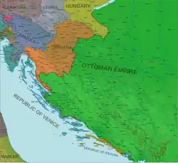 In the early 16th century, most of the Dalmatian hinterland which was controlled by the Hungarian-Croatian Kingdom was lost to the Ottoman Empire by the 1520s which formed the Croatian vilayet that became incorporated into the Sanjak of Klis after the Siege of Klis (1537),[41] and decades later into the Bosnia Eyalet.[42] With the fall of the Hungarian-Venetian border in Dalmatia, Venetian Dalmatia now directly bordered with Ottoman Dalmatia. Venetians still perceived this inner hinterland as once part of Croatia, calling it as "Banadego" (lands of Ban i.e. Banate).[43] The Republic of Venice was also one of the powers most hostile to the Ottoman Empire's expansion, and participated in many wars against it, but also promoted peace negotiations and cultural and religious coexistence and tolerance.[44]