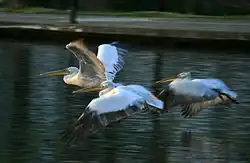 Takeoff from water is particularly energetic. The pelican requires strong pushes with both feet and heavy flapping of its broad wings to become airborne, especially when carrying a full pouch of fish.[33]