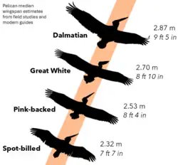 Comparison of the median wingspans of pelican species overlapping with the Dalmatian pelican's distribution. The diagram illustrates the size difference between the Dalmatian pelican and other sympatric pelicans, highlighting its status as the largest pelican species. Median wingspans are based on field measurements and modern standard guides.[17][18][19][20]