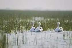 The global population of the Dalmatian pelican is estimated at between 10,000 and 20,000 individuals, with roughly 3,000 to 5,000 breeding pairs.[37] Although the species suffered dramatic declines during the 20th century, several strongholds remain. The largest known breeding colony is found at Small Prespa Lake, which is shared between Greece and Albania and supports around 1,600 pairs. Another significant population persists in the Danube Delta, with approximately 450 pairs recorded there.[37]