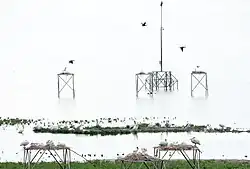 The Dalmatian pelican is protected under the Agreement on the Conservation of African-Eurasian Migratory Waterbirds (AEWA), and several countries have launched national initiatives to protect and restore populations.[37] Artificial nesting platforms have been installed in Turkey, Greece, Bulgaria, and Romania, encouraging breeding where natural nest sites have been lost or degraded.[34] Additionally, floating rafts have been placed in wetlands in Greece and Bulgaria, providing secure nesting spots isolated from predators and human disturbance.[37]