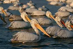 The Dalmatian pelican has silvery-white plumage, which may appear more grey or creamy, especially in winter.[33] A distinguishing feature is the presence of a shaggy crest of curly feathers on the nape and back of the head, giving the bird a notably unkempt appearance compared to the smooth-headed great white pelican (Pelecanus onocrotalus).[34] The legs are dark grey, another feature that helps separate it from related species with pinkish legs.[32]