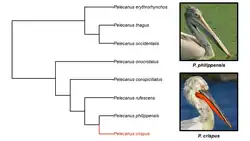 Phylogenetic relationship of the Dalmatian pelican (P. cripus; in red), based on the phylogenetic structure.[11] The division between P. crispus and P. philippensis is emphasized by placing two images next to the phylogeny, exemplifying the morphological differences between them.
