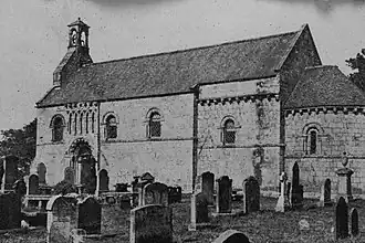 The church is recognised as the finest Norman/Romanesque parish church still in use in Scotland, and one of the most complete in the United Kingdom, lacking only its original western tower, which was replaced in a sympathetic style in 1937 having been long absent.[8] The most notable feature is the ornate archway framing the small main entrance door on the south side. The aisleless nave, choir and apse survive almost complete from the 12th century. The refined sculptural detail of the chancel and apse arches is notable, as is a series of powerful beast-head corbels supporting the apse vault. These features are also extremely well preserved, with the original tool-marks still visible. The elaborate south doorway is carved with symbols representing a bestiary and an "agnus dei", enlivened with blind arcading above. The door is comparable to the north door at Dunfermline Abbey.[8] Nearby is a rare 12th-century sarcophagus carved with 13 doll-like figures (possibly Christ and the 12 apostles) in niches (now very weathered). The churchyard also has a number of fine 17th- and 18th-century gravestones.[9] Interments in the churchyard include the advocate and historian John Hill Burton (1809–81).
