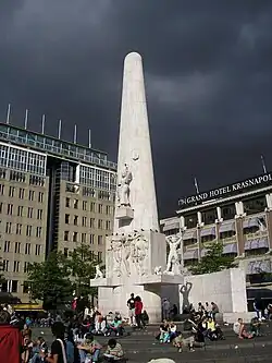 On the west end of the square is the neoclassical Royal Palace, which served as the city hall from 1655 until its conversion to a royal residence in 1808. Beside it are the 15th-century Gothic Nieuwe Kerk (New Church) and the Madame Tussauds Amsterdam Wax Museum. The National Monument, a white stone pillar designed by J.J.P. Oud and erected in 1956 to memorialize the victims of World War II, dominates the opposite side of the square. Also overlooking the plaza are the NH Grand Hotel Krasnapolsky and the upscale department store De Bijenkorf. These various attractions have turned the Dam into a tourist zone.
