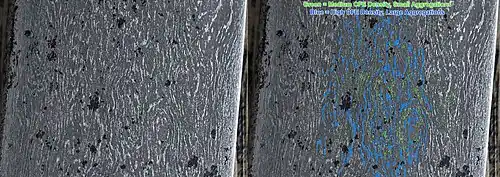 Macroscopic section of crucible steel (left) and false color labeling (right) showing rafts rich in carbide forming elements (CFEs) which lead to clustered cementite spheroids, as well as divorced cementite spheroids.