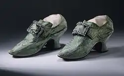 The word damask first appeared in a Western European language in mid-14th century French records.[9] Shortly after its appearance in French language, damasks were being woven on draw looms in Italy. From the 14th to 16th century, most damasks were woven in one colour with a glossy warp-faced satin pattern against a duller ground. Two-colour damasks had contrasting colour warps and wefts, and polychrome damasks added gold and other metallic threads or additional colours as supplemental brocading wefts. Medieval damasks were usually woven in silk, but weavers also produced wool and linen damasks.[10]