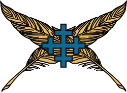 Badge of Dame Margaret Seward, designed by Patric Dickinson (officer of arms) in 2007, (A pair of quills saltirewise Or surmounted by a cross crosslet Azure)
