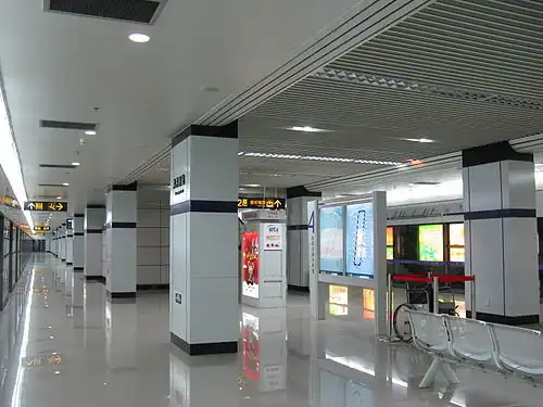 Damuqiao Road (simplified Chinese: 大木桥路; traditional Chinese: 大木橋路; pinyin: Dàmùqiáo Lù) is an interchange station between Line 4 and Line 12 of the Shanghai Metro. This station was one of 16 that opened in the third section from (Qufu Road to Qixin Road) of Line 12 on 19 December 2015.[2] Between 31 December 2005 and 29 December 2007, this station served as the western terminus of Line 4 before the remaining section of the loop between here and Lancun Road opened on 29 December 2007.