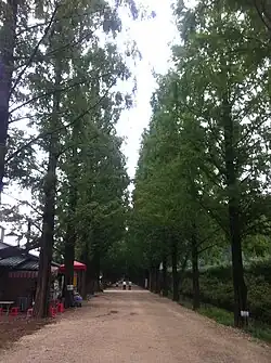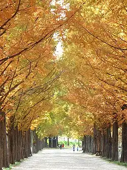 A stretch of metasequoia trees just outside Damyang-eup, planted during the Park Chung Hee administration in the 1970s, has a long walking path of about two kilometers. The trees are particularly striking in late October to early November when their leaves turn bright colors. The walk gained nationwide popularity after a romantic drama was shot here. It was even picked as one of the most beautiful roads in all of Korea.[2]