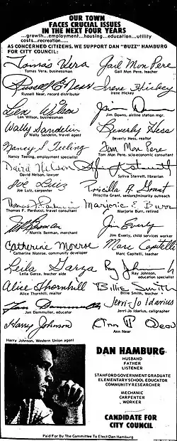 Hamburg first ran for public office in 1976, when he campaigned unsuccessfully for Ukiah City Council.[3][4] He continued to be active in politics as a member of the Democratic Party. He was elected to the Mendocino County Board of Supervisors, serving a four-year term from 1981 to 1985.[5]