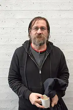 Dan Perjovschi standing in front of a white brick wall of Kiasma | |