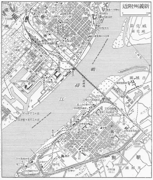 It is the largest Chinese border city,[3] facing Sinuiju, North Korea, across the Yalu River, which demarcates the Sino-North Korean border. To the southwest of the city, the river flows into Korea Bay. Dandong has therefore had a dynamic history because of its strategic location for the northeast's rich natural resources and because of its convenient access to the ocean. It is designated as a major export production centre for the province, and is a port city connected by rail with Shenyang and Sinuiju. A significant amount of trade with North Korea flows through the city.[4]