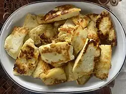 Dangke is a type of cottage cheese produced in Enrekang, South Sulawesi, Indonesia, especially in Enrekang, Baraka, Anggeraja, and Alla districts. Dangke is processed by boiling fresh cattle or buffalo milk with sliced papaya leaves, stems, or unripe papaya fruits. Dangke is typically soaked in a brine solution overnight before being wrapped with banana leaves for masking the bitter taste caused by the addition of papaya leaves.[1]