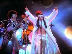 The music video for "Dani California" premiered on April 4, 2006.[11] Directed by Tony Kaye, director of American History X (who was only accepted after initial choice Mark Romanek declined), the video is a quasi-chronology of the evolution of rock music; the band performs the song on a stage, but in a variety of outfits representing important figures and movements in the history of rock, with band members transformed into famous musicians.[5]