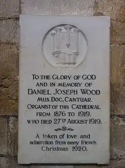 Daniel Wood was a chorister and pupil of J. L. Hopkins at Rochester. He came to Chichester after six years as Organist of Boston Parish Church, Lincs., and followed the then current fashion of a short stay as Organist of Chichester Cathedral, before moving to Exeter Cathedral where he was Organist from 1876 to 1919.[1]