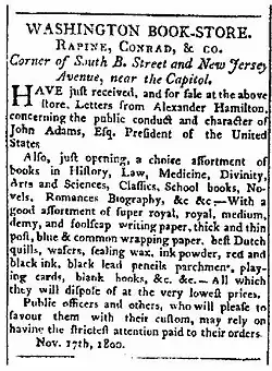 Rapine was a bookseller, printer and politician. He move to Washington from his birthplace of Philadelphia in 1800 to open a bookstore in the new capital. He and his partner John Conrad opened the Washington Printing and Bookselling Company across the street from the Capitol. His bookstore became the intellectual center of early Washington.[1] He married Charlotte Gillette, and had 3 daughters.