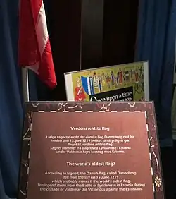 A banner with a white-on-red cross is attested as having been used by the kings of Denmark since the 14th century.[5] An origin legend with considerable impact on Danish national historiography connects the introduction of the flag to the Battle of Lindanise of 1219.[6]