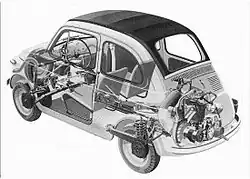 Giacosa's next rear engine car for Fiat was the Nuova 500 of 1957, with a similar layout to the 600, but with a two-cylinder air-cooled engine instead of the water-cooled inline four-cylinder unit, and an unsynchronised 4-speed gearbox (the shortcomings of which being blunted by its own low inertial mass, plus that of the engine and entire vehicle), a layout kept for the entire lifespan of the model. Being a two/plus/two-seat car, it was the true replacement for the Topolino, at the bottom of the Fiat range. With a wheelbase fractionally over six feet and a length under nine feet, it was also a lightweight weighing less than five hundred kilograms. The 479 cc (29.2 cu in) engines in the early production cars were so underpowered, with only 13 bhp (13 PS; 9.7 kW), they were recalled and an uprated 16.5 bhp (12.3 kW) engine fitted. The final 500F of 1965 had a 499 cc (30.5 cu in) engine producing 18 bhp (18 PS; 13 kW), sufficient to get to 95 km/h (59 mph) and a fuel consumption 20 km/L. In 1960 Fiat introduced the Giardiniera, a 499 cc (30.5 cu in) station wagon with a similar inline twin-cylinder engine as the 500, but with cylinder horizontal. The engine was located under the floor at the rear of the car. With a slight increase in wheelbase and the weight increased to 570 kg, it was newer a four-seat car with a luggage area over the engine. In parallel with the Fiat models, the "500", platforms where clothed in prettier bodies by Autobianchi at their Desio factory. Named the Bianchina, a convertible; a four-seat saloon, an estate, and a van on the Giardiniera platform were later added. A version of the Nuova 500 was made by Steyr-Puch in 1957, with their own boxer air-cooled engine and swing axle drive and suspension. The Steyr 650TR of 1965 to 1969 was the hottest 500 model made and a competent rally car. Giacosa was awarded the 1959 Compasso d'Oro for the Nuova 500. He was cited for his "courageous renunciation of the traditional figurative nature of the automobile through a careful re-examination of all its fundamental elements".[12]
