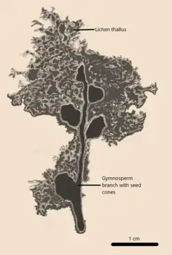 - ^ a b c d e f g h i j k l m n o p Yang, Qiuxia; Wang, Yanyan; Lücking, Robert; Lumbsch, H. Thorsten; Du, Zhenyong; Chen, Yunkang; Bai, Ming; Ren, Dong; Wei, Jiangchun; Li, Hu; Wang, Yongjie; Wei, Xinli (2023-01-20). "The Jurassic epiphytic macrolichen Daohugouthallus reveals the oldest lichen-plant interaction in a Mesozoic forest ecosystem". iScience. 26 (1): 105770. Bibcode:2023iSci...26j5770Y. doi:10.1016/j.isci.2022.105770. ISSN 2589-0042. PMC 9800524. PMID 36590161.