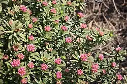 Daphne cneorum, the rose daphne or garland flower, is a species of flowering plant in the family Thymelaeaceae, native across the mountains of central and southern Europe from the Pyrenees east through the Alps, the Apennine, Carpathian and the Balkan Peninsula mountains, and locally in lowlands further north and east to Ukraine and westernmost Russia.[1][2][3] It is a prostrate spreading evergreen shrub growing to 50 cm (20 in) high, with downy stems bearing oblanceolate to spatulate, hairless, evergreen leaves 10–20 mm long and 3–5 mm wide, and highly fragrant pink flowers in dense clusters of 6–8 together in spring.[2][4] All parts of the plant are poisonous to humans.[5]