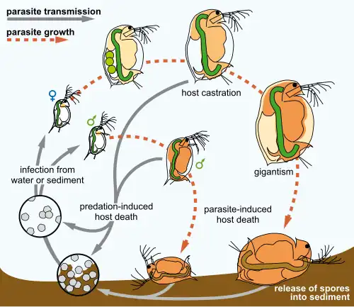 The diagram on the left shows the lifecycle of Pasteuria ramosa, a bacterial parasite of Daphnia. Susceptible hosts acquire the infection from spores in the sediment or in suspension. The parasite develops mainly in the host's body cavity and muscle tissue, increasing in density and eventually expanding to occupy the entire host. Typical effects on the host are sterility and gigantism. Spores are released mainly after the host dies and sinks to the substrate, and sometimes directly to the water via clumsy predation.