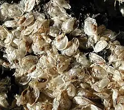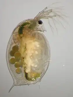 Daphnia magna is a typical water flea of the genus Daphnia. The females reach up to 5 mm in size, the males about 2 mm, thus they are among the largest species in the genus.[2] The body is protected by a translucent carapace made of chitin, a transparent polysaccharide.[3] It has a ventral opening and five pairs of thoracic limbs, used to help the filtering process.[4] Spike rows run along the back of the carapace. The intestine is hook-shaped and has two digestive ceca. The head has two antennae and a large compound eye.[5][6]