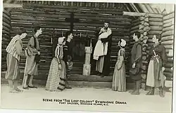 The story of the Lost Colony became popular in the United States following several dramatic accounts published in the 1830s.[3]: 124–130 Eleanor Dare's daughter, Virginia Dare, who was the first child born in an English colony in the New World, became an iconic figure, and celebrations of her birthday became a major North Carolina tourist attraction.[3]: 276–277, 294 In 1937, a Paul Green play, The Lost Colony, debuted on Roanoke Island. President Franklin D. Roosevelt attended a performance on Virginia Dare's 350th birthday.[3]: 141, 347