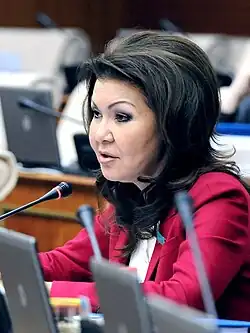 Dariğa Nūrsūltanqyzy Nazarbaeva (Kazakh: Дариға Нұрсұлтанқызы Назарбаева; born 7 May 1963) is a Kazakh businesswoman and politician who is the daughter of Nursultan Nazarbayev who was the President of Kazakhstan from 1990 to 2019. She was a member of the Mäjilis from 2004 to 2007, 2012 to 2015 and 2021 to 2022. She was Deputy Chairwoman of Mäjilis from 2014 to 2015 until being appointed as a Deputy Prime Minister under Massimov's cabinet. She was a member of the Kazakh Senate from 2016 to 2020, serving as Senate Chairwoman from 2019 to 2020. She is one of the richest women in Kazakhstan.[2]