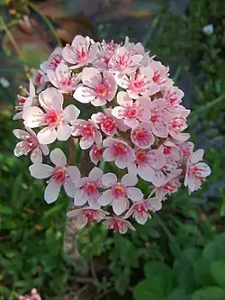 In late spring the flowers emerge before the leaves, with rounded cymes of numerous five-petalled white to bright pink flowers (measuring up to 1.5 cm across each) borne on flower stems up to 2m long. The leaves, up to 60 cm (24 in) long and wide,[4] are peltate, rounded, deeply lobed, coarsely toothed, conspicuously veined and dark green, also on stems petioles up to 2 m (6 ft 7 in) height. The leaves turn red in autumn.