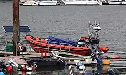 In 2007 a new lifeboat was sent to Dartmouth, although the new station was to be named the Dart Lifeboat Station after the river, rather than the town. A temporary building with five years planning agreement was erected in Coronation Park.[2] The D-class lifeboat is kept on a carriage and is towed to the river for launching by a tractor; the B-class lifeboat is moored in a Drive-on Aquadock moored in the river.[3]