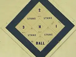 Most boards consist of a four-base diamond: first, second, third, and home plate. Additional areas are marked as strike, out, ball, error, sacrifice, double play, triple play and hit-by-pitch. The home run tends to be in the very center of the board. The diamond is surrounded by a six-inch foul line border. The entire playing field is 42 inches squared including foul territory.[4]