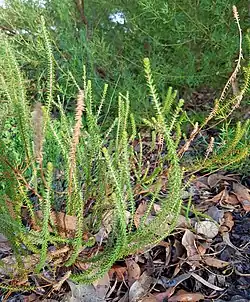 Darwinia whicherensis is an erect or spreading shrub which grows to a height of 700 mm (30 in), a width of 400 mm (20 in) and often uses surrounding vegetation for support. Its leaves are green, linear in shape, triangular in cross-section, 2–4 mm (0.08–0.2 in) long, often crowded at the end of branches and can bend backwards. The flowers are arranged in groups of between 22 and 24, surrounded by several rows of bracts, the largest of which are 22–27 mm (0.9–1 in) long and about 3 mm (0.1 in) wide. The inflorescences are bell-shaped and hang down. The individual flowers have white petals and the style is red, curved and 10–16 mm (0.4–0.6 in) long.[2][3]