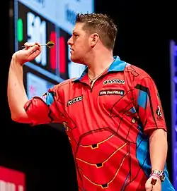 Gurney's Irish Matchplay title earned him a place in the preliminary round of the 2015 World Championship and Scott MacKenzie missed one dart to eliminate him 4–0.[11] Instead, Gurney levelled at 3–3 before MacKenzie missed a dart at double 11 to complete a 142 finish which allowed him to step in and seal a 4–3 win. Gurney then lost 3–1 against Ronnie Baxter in the first round.[12] From the last 32 stage of the fifth UK Open Qualifier, Gurney beat Alan Norris, Peter Wright and Dave Chisnall to reach his first PDC semi-final where he was defeated 6–2 by Michael Smith.[13] The performance helped him to enter the UK Open at the third round stage and he thrashed Kevin McDine 9–1 to play John Henderson in the fourth round.[14] Gurney won five legs in a row between 13 and 15 darts to surge 8–7 ahead, before Henderson sent the tie into a deciding leg which he won.[15] His second semi-final came at the 10th Players Championship event and he was eliminated 6–3 by Joe Murnan.[16] Gurney lost 2–0 in sets to Robert Thornton in the first round of the World Grand Prix, but two quarter-final exits saw him play in the Players Championship Finals for the first time. He averaged 101.38 in a 6–2 victory over Kim Huybrechts and then knocked out reigning world champion Gary Anderson 10–4, winning the last six legs in a row, to reach his first major quarter-final.[17][18] Gurney then advanced to the semi-finals with a 10–5 victory over Benito van de Pas, but from level at 2–2 with Michael van Gerwen, Gurney lost nine successive legs to exit the tournament.[19]