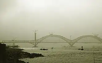 The Dashengguan Yangtze River Bridge (simplified Chinese: 大胜关长江大桥; traditional Chinese: 大勝關長江大橋; pinyin: Dàshèngguān Chángjiāng Dàqiáo; lit. 'pass of the great victory') crosses the Yangtze River in Nanjing, Jiangsu. Construction of the bridge started in 2006 and it was completed in 2010. The bridge has two main spans of 336 m (1,102 ft) it is one of the largest arch bridges in the world.[2] It carries six tracks: two for the Beijing–Shanghai High-Speed Railway[3] (opened on 30 June 2011), two for the Shanghai–Wuhan–Chengdu high-speed railway (opened on 22 January 2011) and two for line S3 of the Nanjing Metro (opened on 6 December 2017).