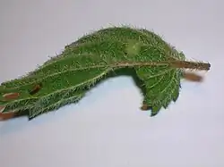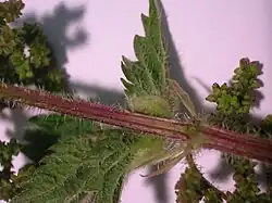 The nettle pouch gall develops in leaf veins, leaf petioles, flower stalks and sometimes the stem of Urtica dioica (and less commonly Urtica urens). This structure is caused by the gall midge Dasineura urticae,[1] sometimes misspelled Dasyneura urticae.[2] Obsolete synonyms are Perrisia urticae and Cecidomyia urticae.[3]